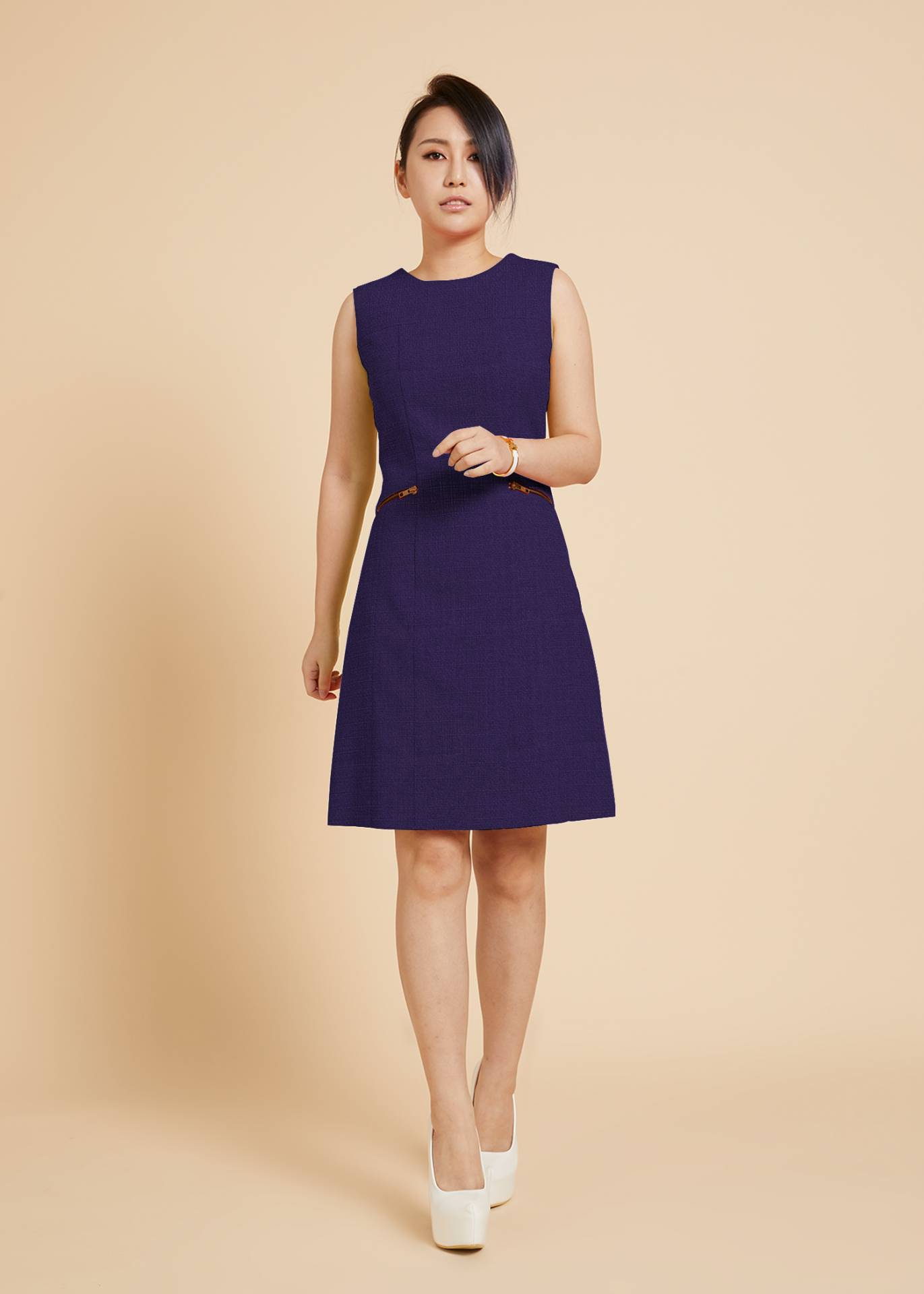 腰間左右加上古銅拉鍊,更添設計感,選用純淨靚色面料,